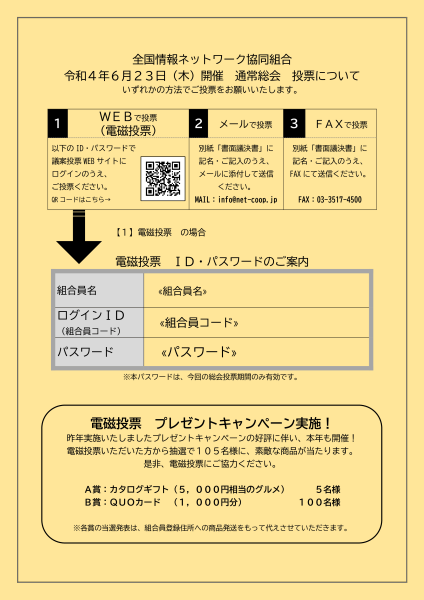 2022年6月23日(木)開催 全国情報ネットワーク協同組合第26回通常総会は、WEBによる投票(電磁投票)を受け付けております。